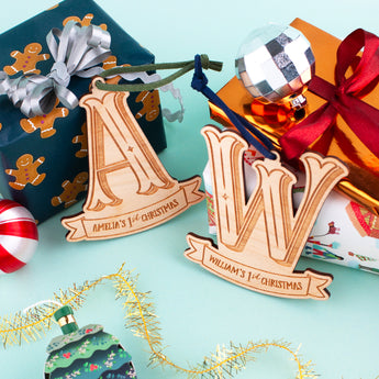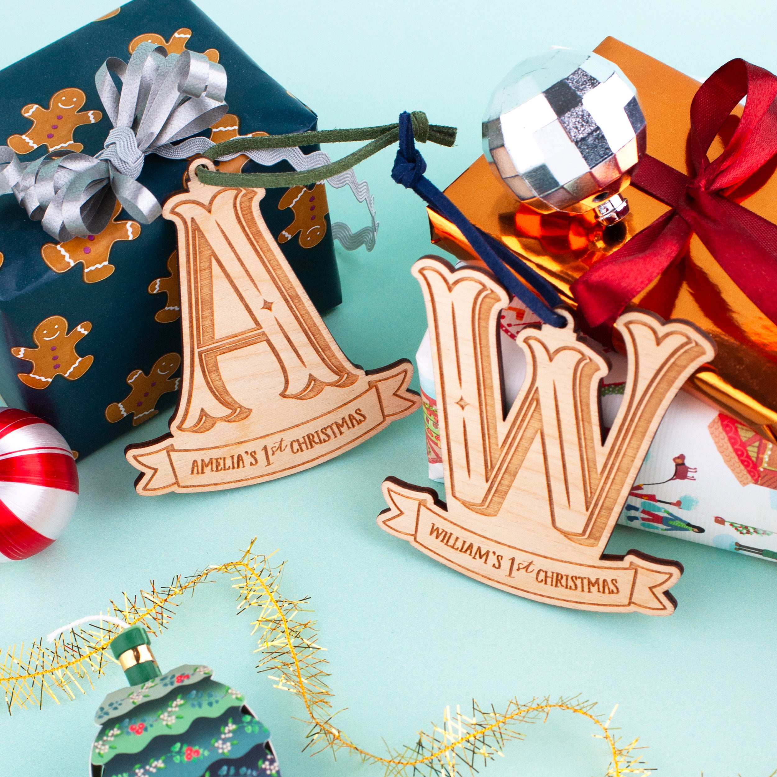 This beautifully engraved Christmas tree decoration is the perfect way to add a personalised touch to your festive celebrations, and commemorate your first Christmas as an extended family.