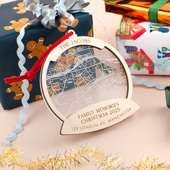 Featuring a delicate map design engraved onto clear acrylic, framed by warm Maple wood, this layered decoration creates a stunning snow globe effect, perfect for commemorating a special location in your love story.