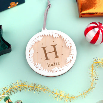 Add a modern twist to your festive décor with our handmade initial bauble, combining the warmth of natural wood with the elegance of a crisp white wreath. The centre is crafted from 3mm maple plywood, engraved with your chosen initial and name, while the delicate wreath detail is laser cut from 3mm white acrylic for a striking contrast.