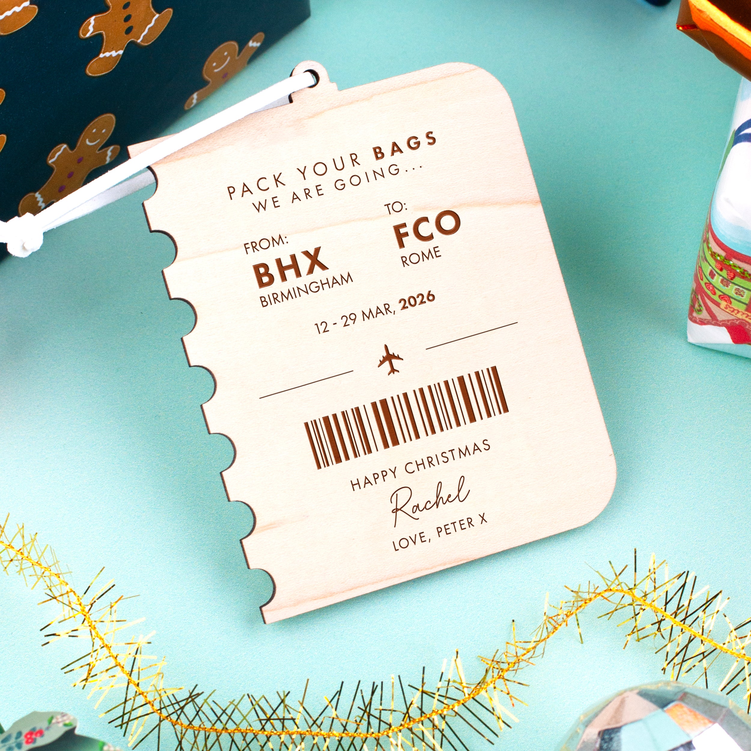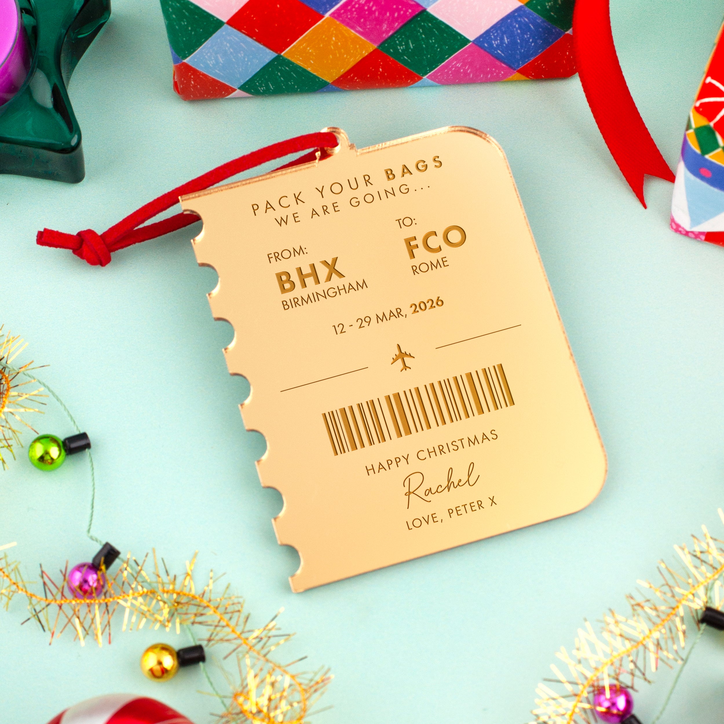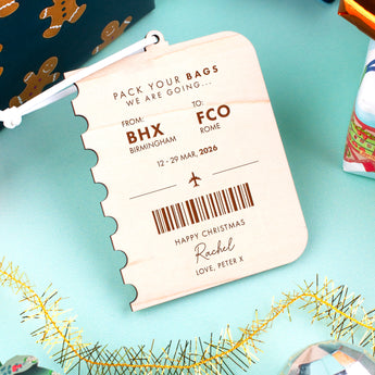 The perfect way to gift a special journey this Christmas, with this unique engraved Pack Your Bags Boarding Pass bauble, the perfect keepsake for celebrating travels, reunions, or adventures shared.